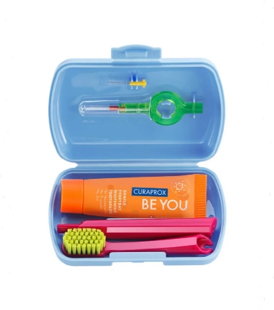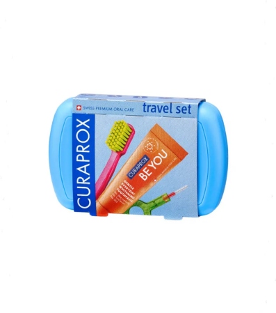 An exceptional, compact travel toothbrush, 10ml zesty fresh whitening toothpaste and two interdental brushes with a handy holder. The ultimate Curaprox oral health care.