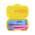 Vibrant and compact oral care set for maintaining a healthy smile during trips.