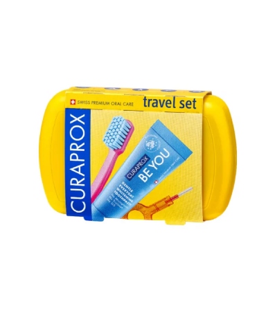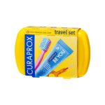 An exceptional, compact travel toothbrush, 10ml zesty fresh whitening toothpaste and two interdental brushes with a handy holder. The ultimate Curaprox oral health care.